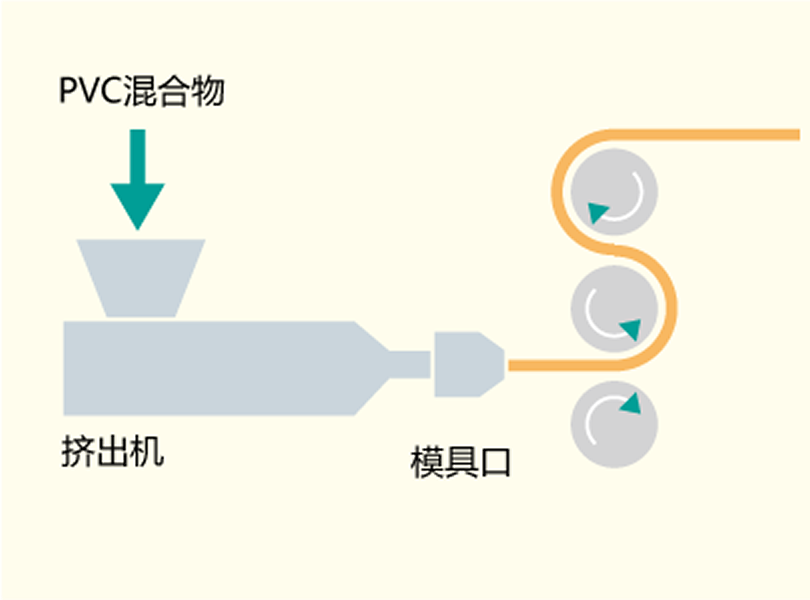 通过挤出机,从模具口挤出板材,使用滚轮调整板材厚度并赋上表面光泽。
